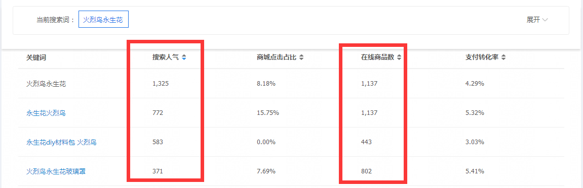 比如这个火烈鸟永生花在线商品就只有1137个,跟前面大词下20万+在线商品相比肯定更容易被买家搜索到。 新手同学大多以为只要写了标题就可以被搜索到,就会有访客,事实上并不是这样哦,想要一开始就拿到免费流量 ,建议从长尾词入手找到类目下的细分市场。