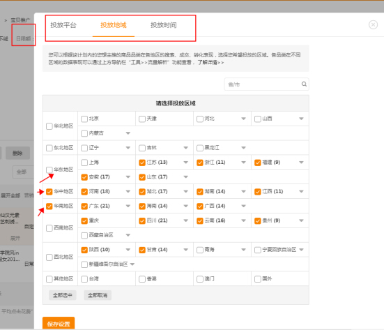 直通车单独开一个计划,加入这个测试出来的宝贝,然后这个计划我们日限额首次限额30元,然后平台选择无线站内,时间折扣全天100%,地域主要集中华中、华南、华北地域,有特殊类目的可以来调整更大的范围。
