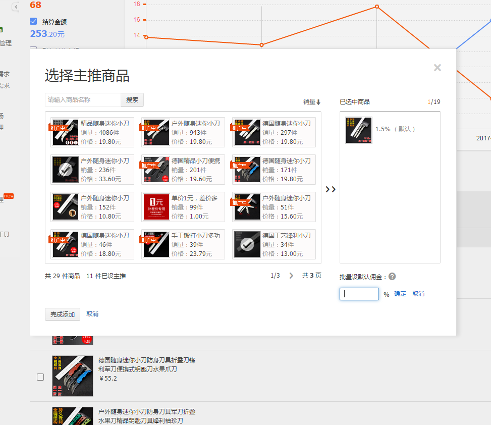 选择产品后设置佣金比。设置佣金的时候可以设置高点,以便于后期的定向招商。后期我们还可以修改编辑佣金比,任何一词淘客佣金的修改都会在晚上24点生效。如果后期这个宝贝不想做了我们就可以删掉它。
