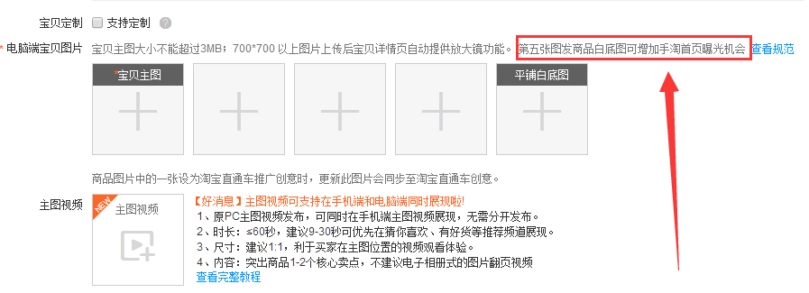 主图白底(才有可能被抓取)并在第五张的位置 ,我们在发布宝贝主图的时候系统会提示,宝贝第五张主图为白底图会增加手淘首页展现曝光的机会。我们在发布的时候第五张主图一定要去选择白色或者纯色的宝贝主图,这样会大大的增加我们手淘展现和曝光的机会。