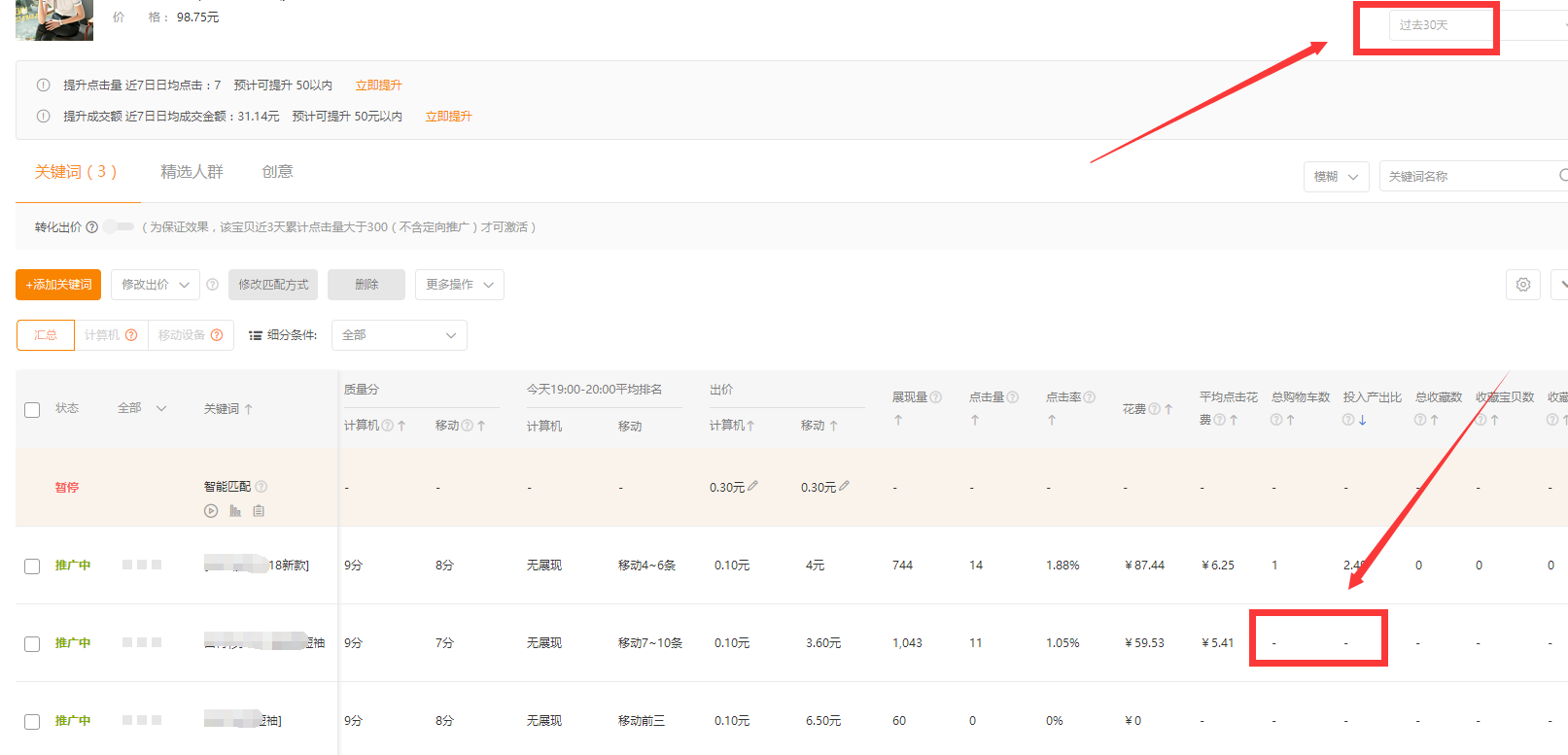 1.以投产为优化主导:但如果在30天内有展现,有点击,有收藏加购,但都没有投产的词,直接删除!一切不以赚钱为目的,留着也没用,这一点大家一定要决断力,不然我们何时能赚钱。