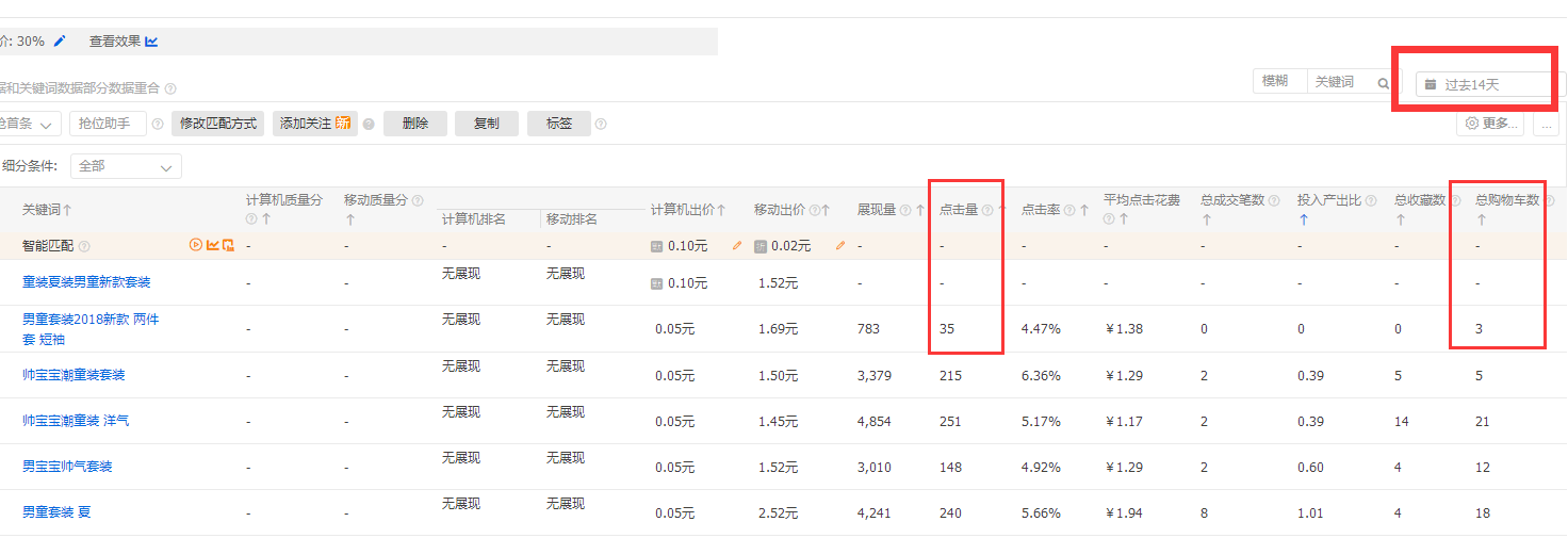 这样是让在数据体量不太大的时候,优化一些可能会让我们产生损失的词,比如14天内没有产出的词也可以删除,但如果收藏加购比较高的话,可以放一下,如点击率在10%左右的可以先做保留,如图